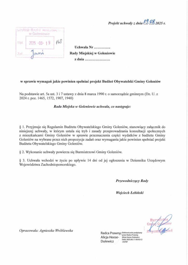 Miał być dzisiaj przegłosowany projekt uchwały dotyczący wymagań jakie miałby spełniać Budżet Obywatelski. Trzeba tu koniecznie powiedzieć, że to jest novum w budżecie Gminy Goleniów. Takie narzędzie do tej pory nie funkcjonowało w naszej Gminie. Generalnie to świetny pomysł na pobudzenie obywatelskiej aktywności i inicjatywy społecznej mieszkańców, którzy będą mogli realizować swoje pomysły.