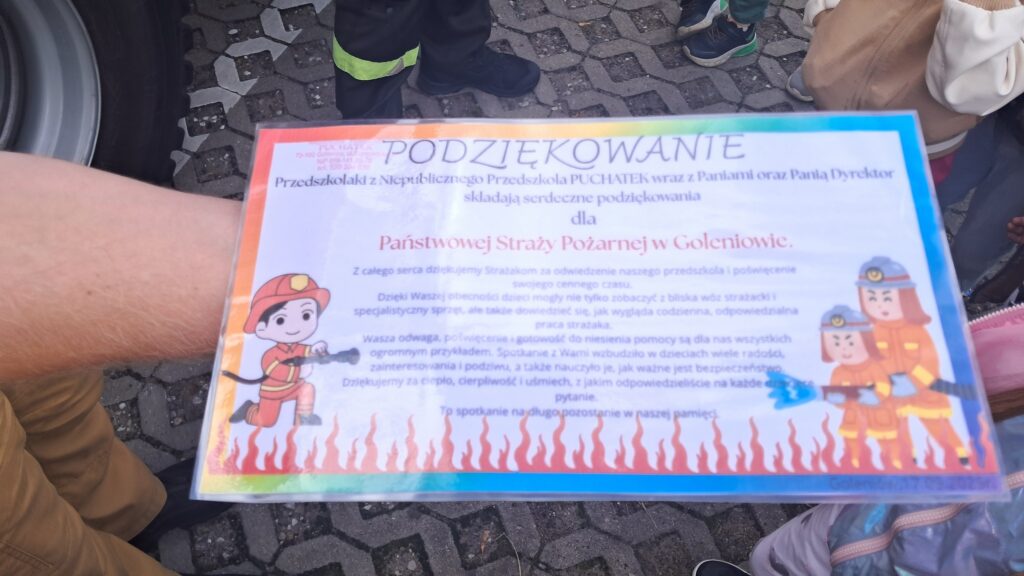 Na koniec przedszkolaki wręczyli strażakom podziękowania za przybycie i… pudełeczko z cukierkami. Przedszkole Puchatek odwiedzili panowie: Marek Radawiec, Marcin Krysztowiak i Piotr Woźniak z Komendy Powiatowej Straży Pożarnej w Goleniowie.