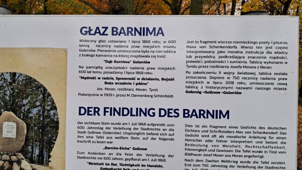 Głaz Barnima stanął dokładnie 157 lat temu, 1 lipca 1868 roku w 600 rocznicę nadania praw miejskich Goleniowa. Pierwotnie zamontowano na nim białą kamienną tablicę z napisem: „Dąb Barnima” Goleniów. Dąb został posadzony obok by upamiętnić ten moment. Na tablicy wyryto wówczas napis: „Mądrość w radzie. Sprawność w działaniu, Bojaźń Boża wcześnie i późno”. Twórcą tablicy był rzeźbiarz z Tyrolu – Josef Moser z Meran. Po II wojnie światowej tablica została zniszczona. Ta która jest obecnie, została zamontowana w 2018 roku w 750 rocznicę nadania praw miejskich. Na tablicy można przeczytać napis z historycznymi nazwami naszego miasta – Gołonóg, Golnow, Goleniów. Miejsce, w którym jest Głaz”, nieco schowane w obecnym Parku Ignacego Jana Paderewskego, dobrze widoczne jest z obecnej Rampy Kultury Twierdzy Designe.