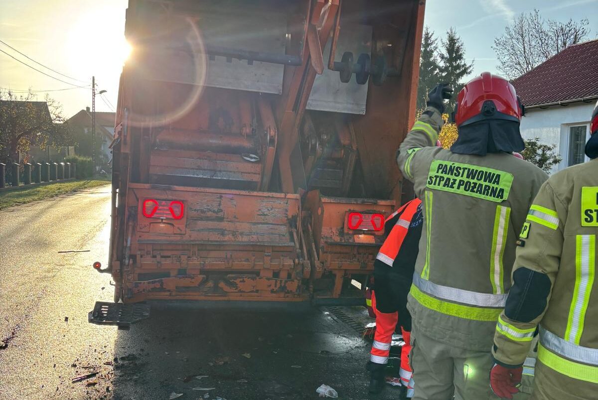 Samochód osobowy KIA uderzył w tył „śmieciarki” – poszkodowany pracownik PGK