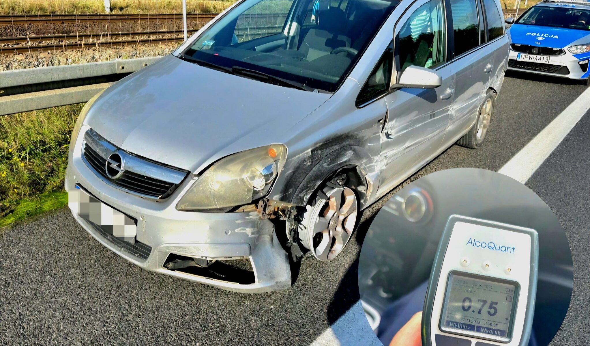 Po przybyciu patrolu okazało się, że 39-latek uderzył wcześniej w barierki energochłonne, po czym — mimo wyraźnych uszkodzeń — dalej prowadził samochód. Badanie wykazało 0,75 mg/l alkoholu w wydychanym powietrzu, czyli około 1,6 promila. Mężczyźnie natychmiast zatrzymano prawo jazdy i dowód rejestracyjny, a pojazd odholowano z drogi.