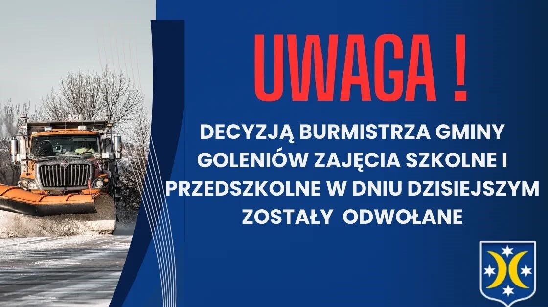 W związku z zagrożeniem bezpieczeństwa odwołano zajęcia dydaktyczno-wychowawcze we wszystkich szkołach i przedszkolach, dla których organem prowadzącym jest Gmina Goleniów. Zawieszone zostały również połączenia autobusowe, w tym komunikacja szkolna.
