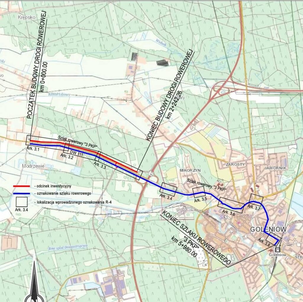 Z opracowania wyłączone zostało samo przejście przez węzeł Goleniów Zachód. Tu rowerzyści będą musieli korzystać z dotychczasowego rozwiązania. Za węzłem, trasa będzie przebiegała po istniejących ciągach pieszo-rowerowych wzdłuż ulic: Wojska Polskiego, Armii Krajowej i Szkolnej. To ta część trasy zostanie oznakowana. Oznakowany zostanie też ostatni odcinek trasy o długości 150 m, który będzie przebiegał ulicą Kazimierza Pułaskiego. Koniec nowego szlaku znajduje się na placu przed dworcem PKP w Goleniowie.