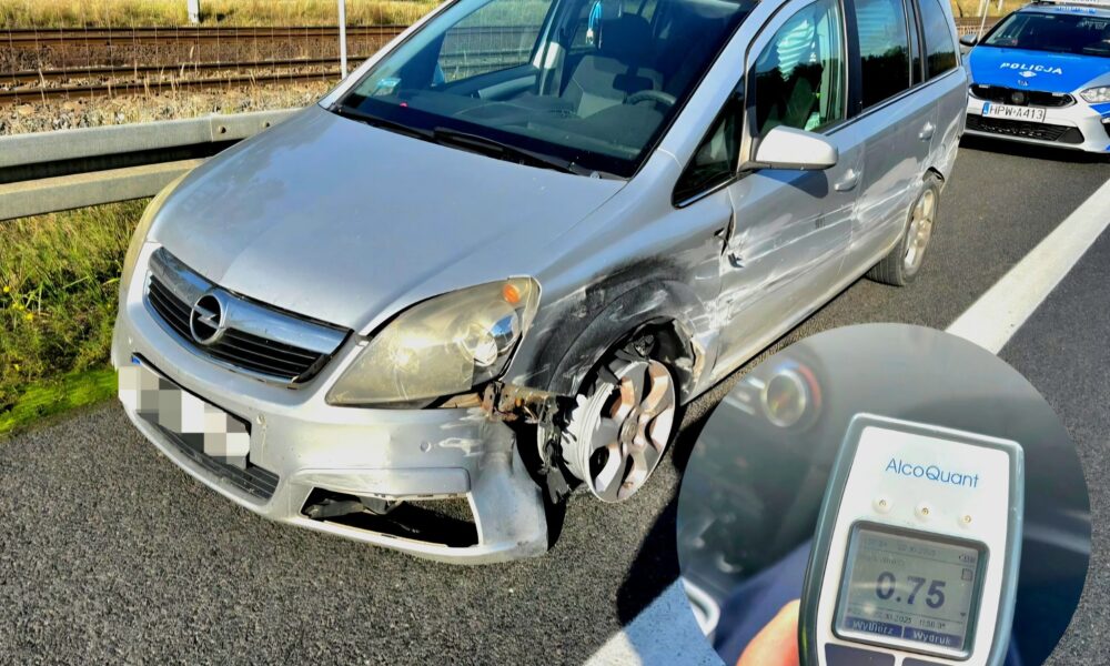 Na trasie S3 widok rodem z kreskówki: Opel z wystrzelonymi poduszkami powietrznymi i… bez lewej przedniej opony. Za kierownicą 39-latek, który po uderzeniu w barierki próbował...