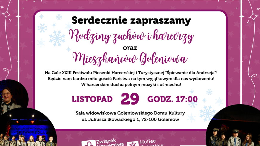 Zapraszamy na muzyczne święto, zuchów, harcerzy i wszystkich miłośników piosenki turystycznej — Gala XXIII Festiwalu Piosenki Harcerskiej i Turystycznej „Śpiewanie dla Andrzeja”. Spotkanie odbędzie się 29...