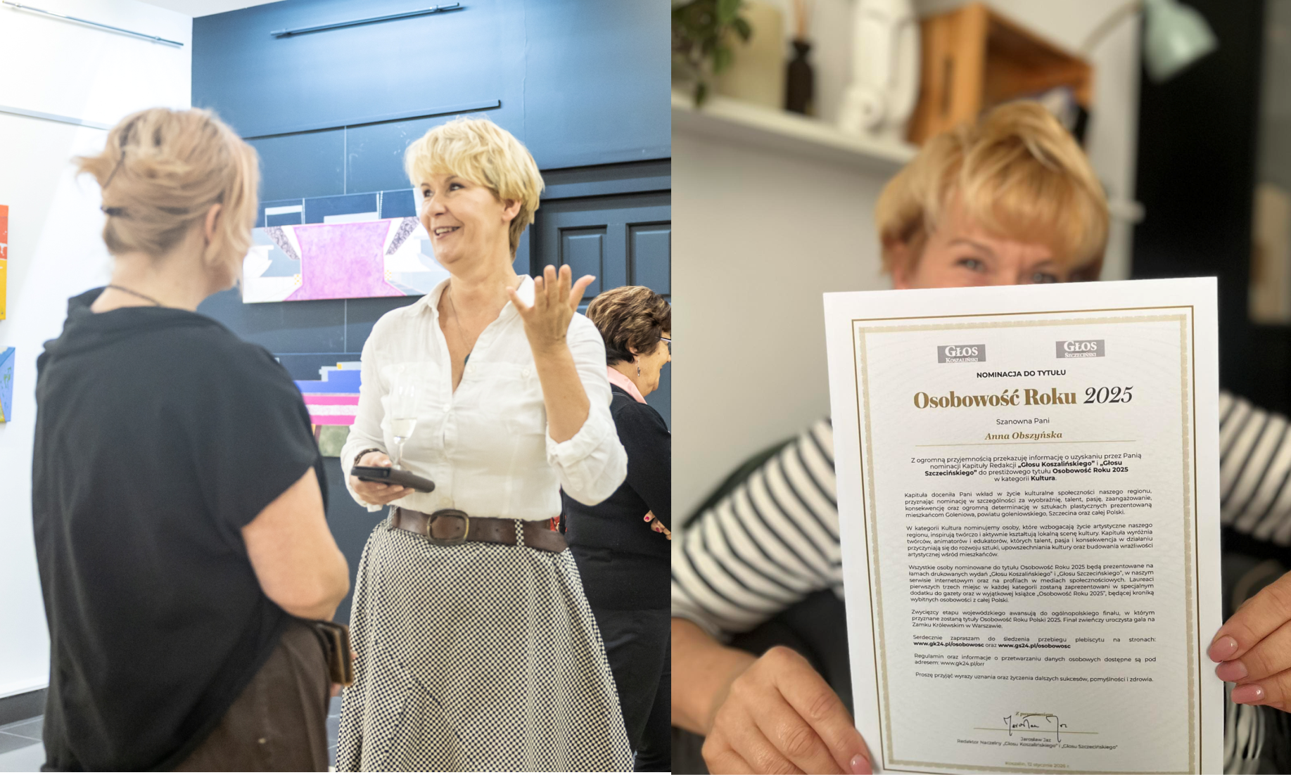 Niektóre nominacje budzą wątpliwości, inne – absolutną pewność. Nominacja Ani Obszyńskiej, znanej goleniowianki, pracownika Goleniowskiego Domu Kultury, w końcu specjalistki d/s sztuk plastycznych, a właściwie określiłbym ją jednym mianem artystki do tytułu Osobowość Roku, organizowanego przez redakcję Głosu Szczecińskiego, należy zdecydowanie do tej drugiej kategorii. Znam Anię od lat i wielokrotnie miałem okazję z nią współpracować jako przedstawiciel Radia Nasz Goleniów – zawsze jako z osobą niezwykle uczciwą, zaangażowaną i całkowicie oddaną temu, co robi. To nie jest kandydatura oparta na autopromocji, lecz na realnej, wieloletniej pracy na rzecz kultury, sztuki i ludzi.
