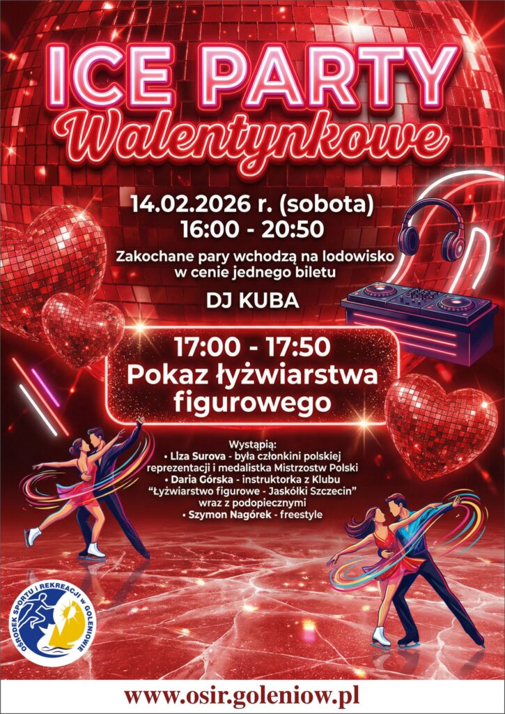 Zbliża się zaadaptowany na nasz grunt ze Stanów Zjednoczonych święto zakochanych – WALENTYNKI. Można go będzie spędzić w nietypowy sposób, a mianowicie na goleniowskim lodowisku. OSiR przygotował w ten dzień specjalne ICE PARTY – Walentynkowe